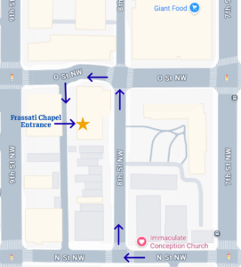 A. The chapel may be accessed directly via the alleyway behind the Intersect at O apartment building (1338 8th St NW) using a secure code.